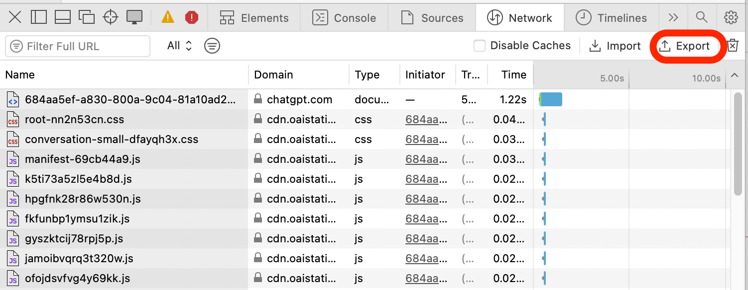 Export the HAR: Click the "Export" icon, give it a name, and save the HAR file.